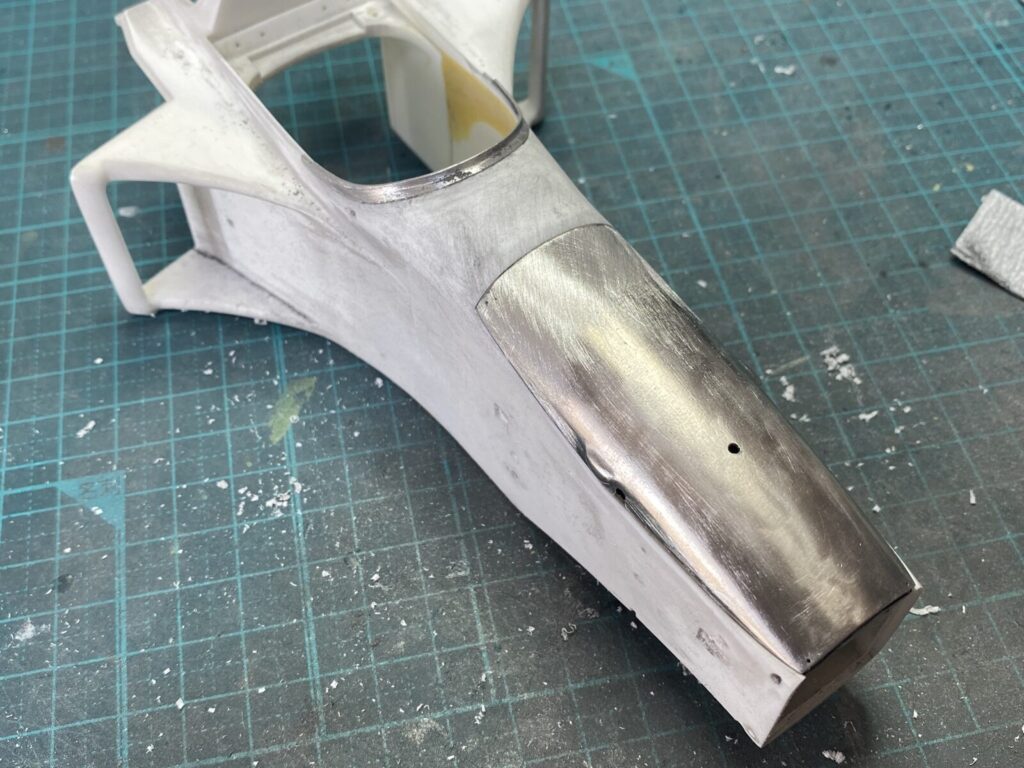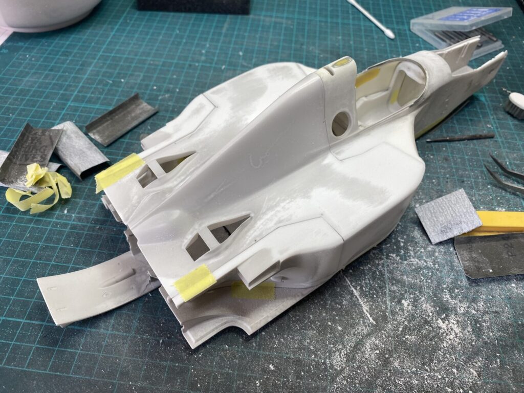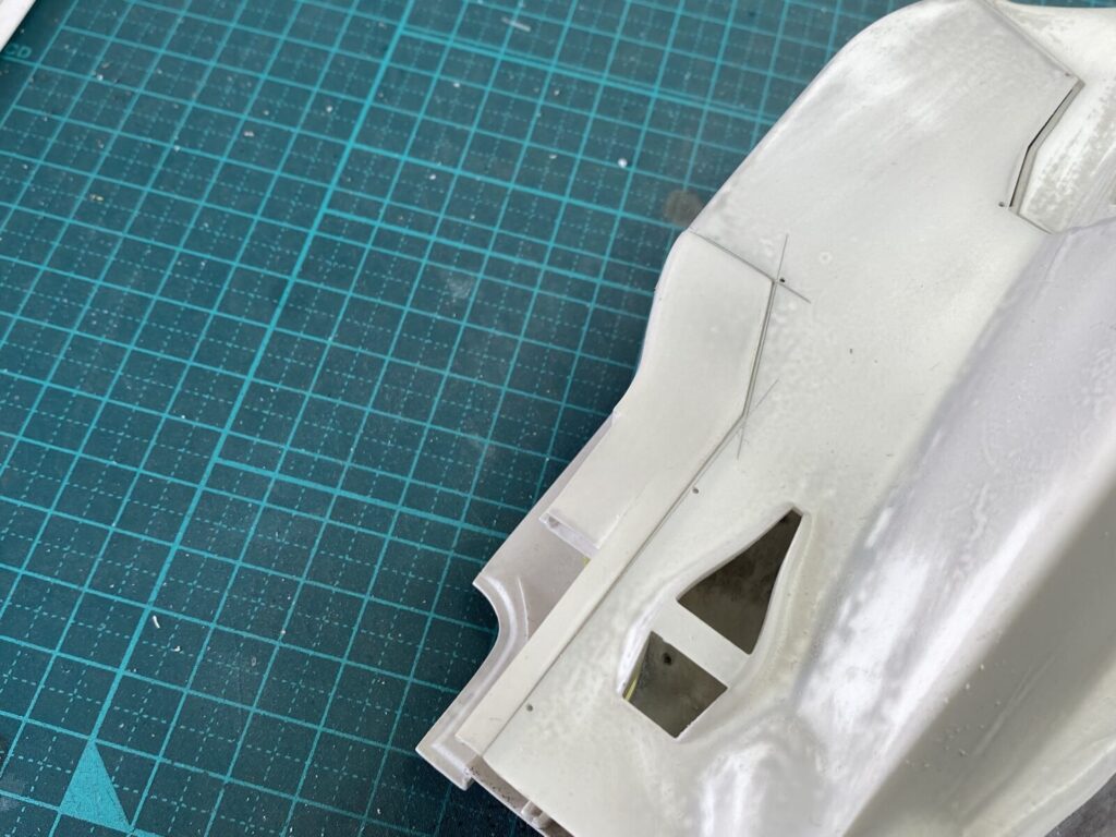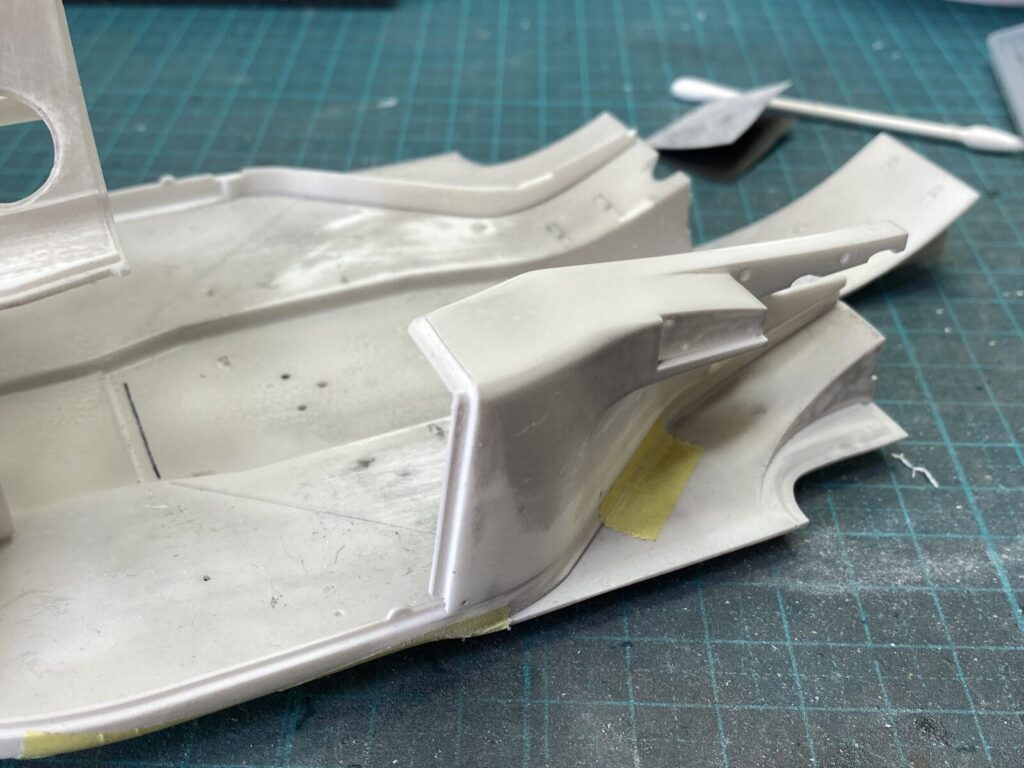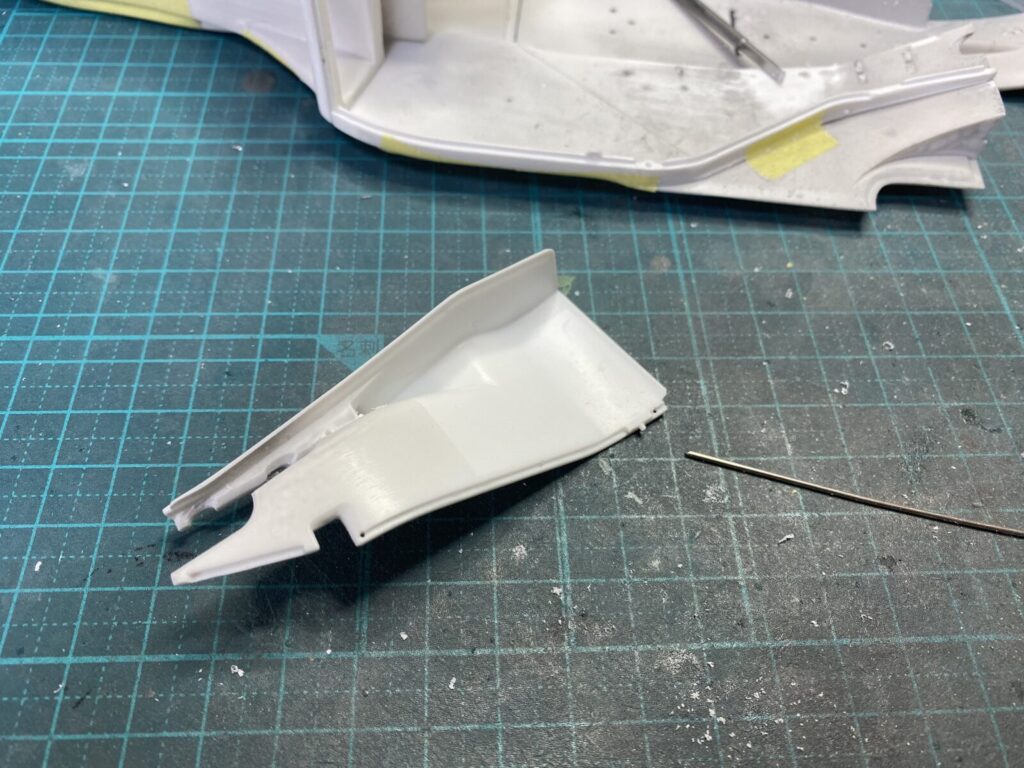 リアカウルを装着して修正箇所をチェックします。カウルの収まりは全体的に良好ですが、塗装の厚みを考慮してクリアランスを確保するため、少し削って調整しておきます。
